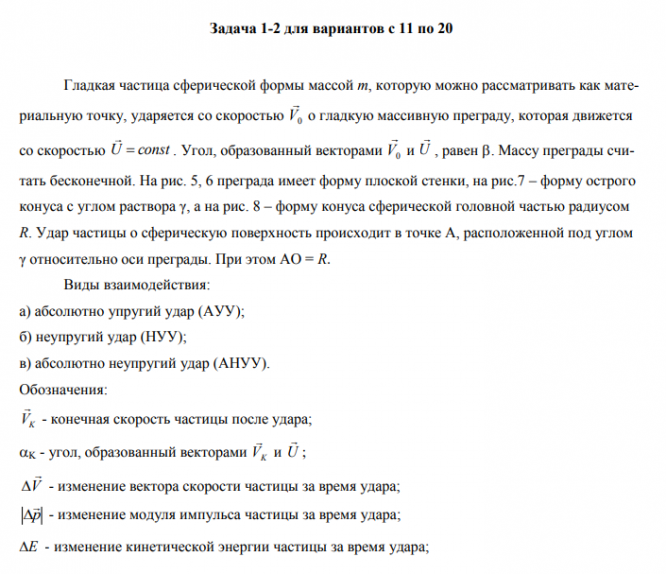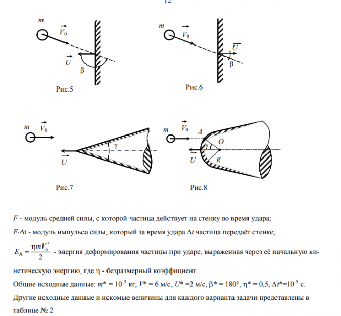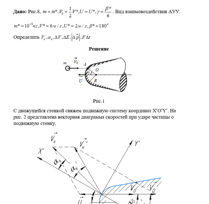 Гладкая частица сферической формы массой m, которую можно рассматривать как материальную точку, ударяется со скоростью V0 о гладкую массивную преграду, которая движется со скоростью U const . Угол, образованный векторами V0 и U , равен . Массу преграды считать бесконечной. На рис. 5, 6 преграда имеет форму плоской стенки, на рис.7 – форму острого конуса с углом раствора γ, а на рис. 8 – форму конуса сферической головной частью радиусом R. Удар частицы о сферическую поверхность происходит в точке А, расположенной под углом γ относительно оси преграды. При этом АО = R. Виды взаимодействия: а) абсолютно упругий удар (АУУ); б) неупругий удар (НУУ); в) абсолютно неупругий удар (АНУУ). Обозначения: VK - конечная скорость частицы после удара; K - угол, образованный векторами VK и U ; V - изменение вектора скорости частицы за время удара; p - изменение модуля импульса частицы за время удара; E - изменение кинетической энергии частицы за время удара;