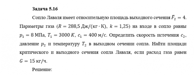 Для студентов по предмету ФизикаЗадача 5.16 Сопло Лаваля имеет относительную площадь выходного сечения F ̅_2=4. Параметры газа (R=288,5 Дж/(кг∙К), k=1,25) на входе в сопло равны p_1=Задача 5.16 Сопло Лаваля имеет относительную площадь выходного сечения F ̅_2=4. Параметры газа (R=288,5 Дж/(кг∙К), k=1,25) на входе в сопло равны p_1=