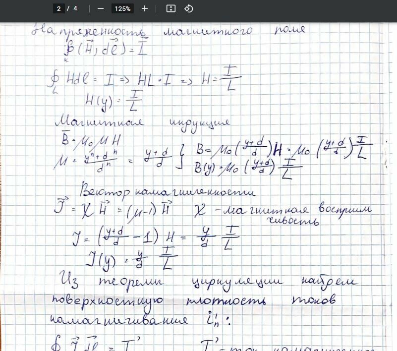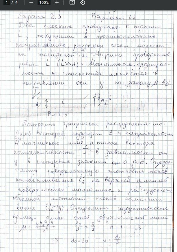 Построить графически распределения модулей векторов индукции B и напряжённости H магнитного поля, а также вектора намагниченности J в зависимости от у в интервале значений от 0 до d. Определить поверхностную плотность токов намагничивания на верхней и нижней поверхностях магнетика и распределение объёмной плотности токов намагничивания .Определить индуктивность единицы длины этой двухполосной линии.