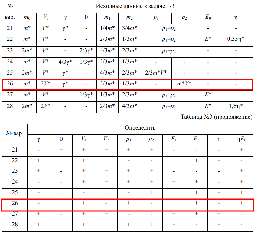 Нерелятивистская частица с внутренней энергией E0 и массой m0, летящая со скоростью V0 , распадается на две нерелятивистские частицы, скорости которых V1 и V2 , массы m1 и m2, импульсы 1 p и p2 , кинетические энергии E1 и E2. При этом часть внутренней энергии E0 исходной частицы в количестве E0, где коэффициент <1 , расходуется на увеличение кинетической энергии образовавшихся частиц. На рис. 12 γ - угол разлета частиц, т.е. угол, образованный векторами 1 p и p2 , - угол отклонения первой частицы (из вновь образовавшихся) от направления движения исходной частицы, т.е. угол, образованный векторами p0 и 1 p , где p0 m0V0 . Общие исходные данные: m* = 10-2 кг, V* = 10 м/с, γ* = /2, E* = 10 Дж , *=0,5. Другие исходные данные и искомые величины для каждого варианта задания представлены в таблице №3.