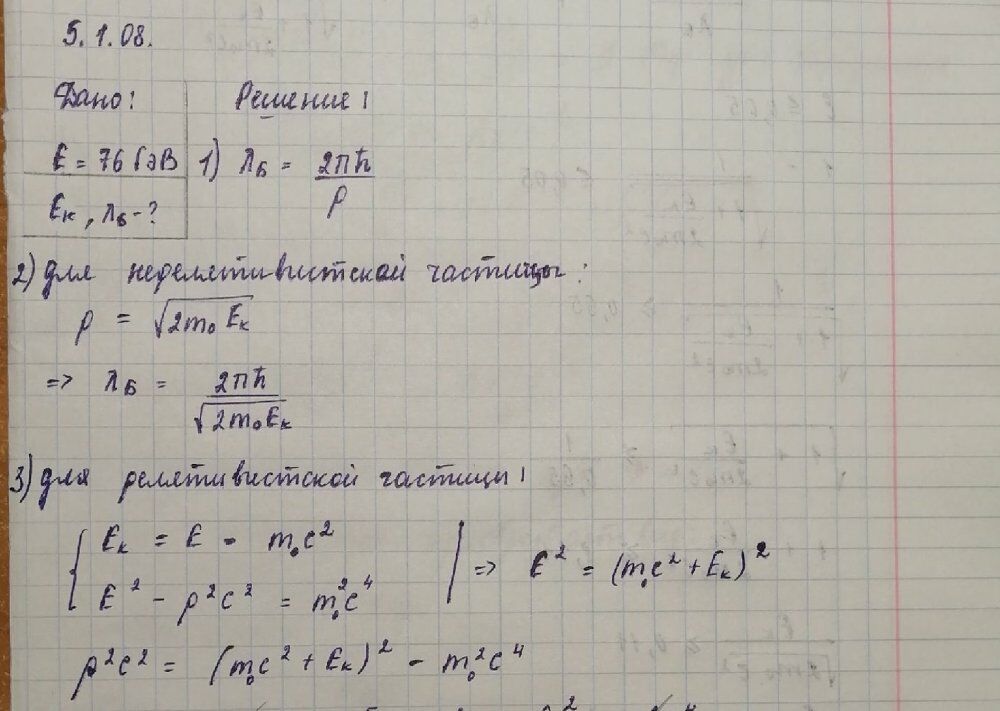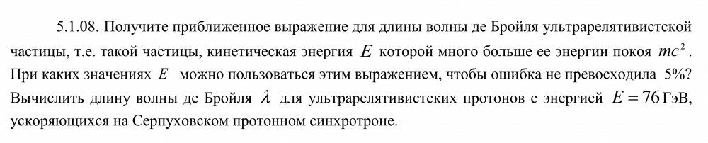 5.1.08. Получите приближенное выражение для длины волны де Бройля ультрарелятивистской частицы, т.е. такой частицы, кинетическая энергия E которой много больше ее энергии покоя 2 mc . При каких значениях E можно пользоваться этим выражением, чтобы ошибка не превосходила 5%? Вычислить длину волны де Бройля для ультрарелятивистских протонов с энергией E 76 ГэВ, ускоряющихся на Серпуховском протонном синхротроне.