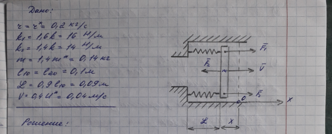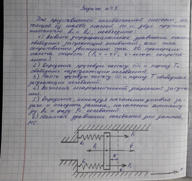 Третья задача из семестрового домашнего задания по физике за 2 семестр. Необходимо рассчитать параметры приведенной в условии колебательной системы и написать уравнение ее колебаний.
