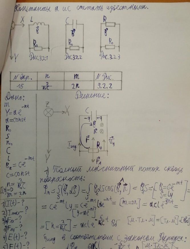 Условие:По двум гладким медным шинам скользит перемычка массы M, закон движения которой задан Y = f(t). Сопротивление перемычки равно , поперечное сечение S, концентрация носителей заряда (электронов) в проводнике перемычки равна . Сверху шины замкнуты электрической цепью, состоящей из конденсатора ёмкости С. Расстояние между шинами l. Система находится в однородном переменном магнитном поле с индукцией B(t), перпендикулярном плоскости, в которой перемещается перемычка. Сопротивление шин, скользящих контактов, а также самоиндукция контура пренебрежимо малы. Ток через конденсатор в начальный момент времени равен 0.