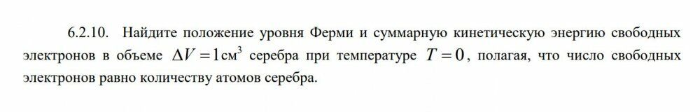 Задачи 6.2.106.2.10. Найдите положение уровня Ферми и суммарную кинетическую энергию свободных электронов в объеме V 1 см3 серебра при температуре T 0 , полагая, что число свободных электронов равно количеству атомов серебра.