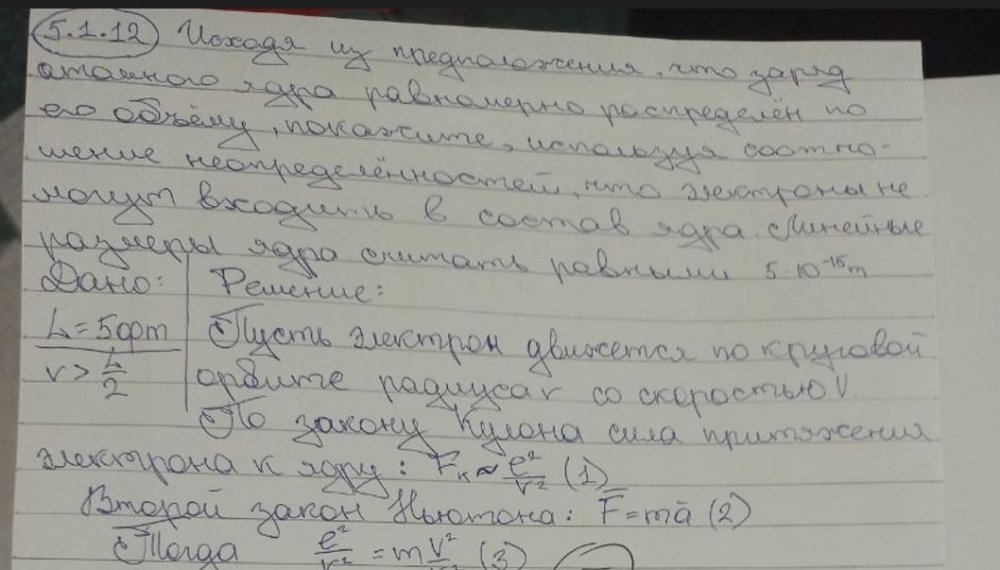 5.1.12. Исходя из предположения, что заряд атомного ядра равномерно распределен по его объему, покажите, используя соотношение неопределенностей, что электроны не могут входить в состав ядра. Линейные размеры ядра считать равными 5 15 10  м.