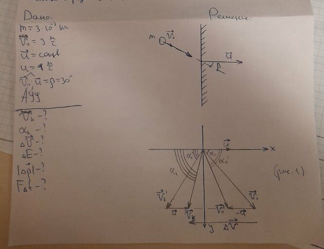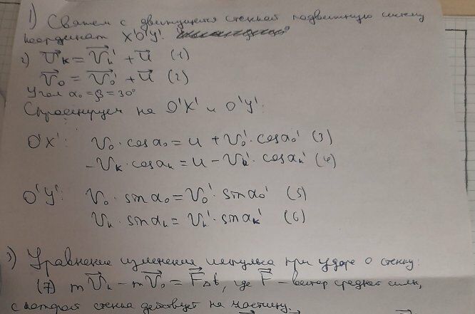 Условие:Гладкая частица сферической формы массой m, которую можно рассматривать как материальную точку, ударяется со скоростью о гладкую массивную преграду, которая движется со скоростью . Угол, образованный векторами и , равен . Массу преграды считать бесконечной. На рис. 5, 6 преграда имеет форму плоской стенки, на рис.7 – форму острого конуса с углом раствора γ, а на рис. 8 – форму конуса сферической головной частью радиусом R. Удар частицы о сферическую поверхность происходит в точке А, расположенной под углом γ относительно оси преграды. При этом АО = R.Виды взаимодействия:а) абсолютно упругий удар (АУУ);