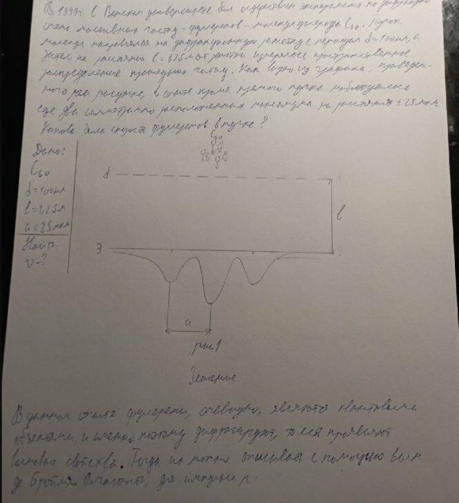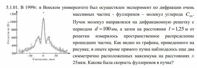5.1.01. В 1999г. в Венском университете был осуществлен эксперимент по дифракции очень массивных частиц - фуллеренов – молекул углерода С60 . Пучок молекул направлялся на дифракционную решетку с периодом d 100нм, а затем на расстоянии l 1,25 м от решетки измерялось пространственное распределение прошедших частиц. Как видно из графика, приведенного на рисунке, в опыте кроме прямого пучка наблюдалось еще два симметрично расположенных максимума на расстояниях ± 25мкм. Какова была скорость фуллеренов в пучке?
