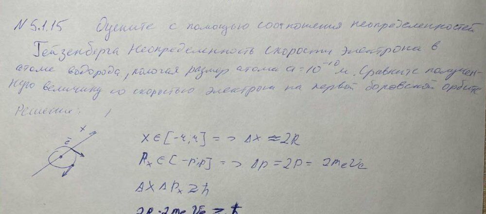5.1.15. Оцените с помощью соотношения неопределенностей Гейзенберга неопределенность скорости электрона в атоме водорода, полагая размер атома 10 10 a м. Сравните полученную величину со скоростью электрона на первой боровской орбите.