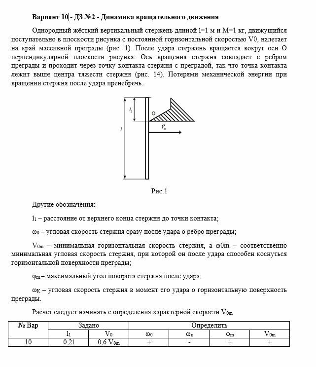 Однородный жёсткий вертикальный стержень длиной l=1 м и М=1 кг, движущийся поступательно в плоскости рисунка с постоянной горизонтальной скоростью V0, налетает на край массивной преграды (рис. 1). После удара стержень вращается вокруг оси O перпендикулярной плоскости рисунка. Ось вращения стержня совпадает с ребром преграды и проходит через точку контакта стержня с преградой, так что точка контакта лежит выше центра тяжести стержня (рис. 14). Потерями механической энергии при вращении стержня после удара пренебречь.Другие обозначения:l1 – расстояние от верхнего конца стержня до точки контакта;ω0 – угловая скорость стержня сразу после удара о ребро преграды;V0m – минимальная горизонтальная скорость стержня, а ω0m – соответственно минимальная угловая скорость стержня, при которой он после удара способен коснуться горизонтальной поверхности преграды;
