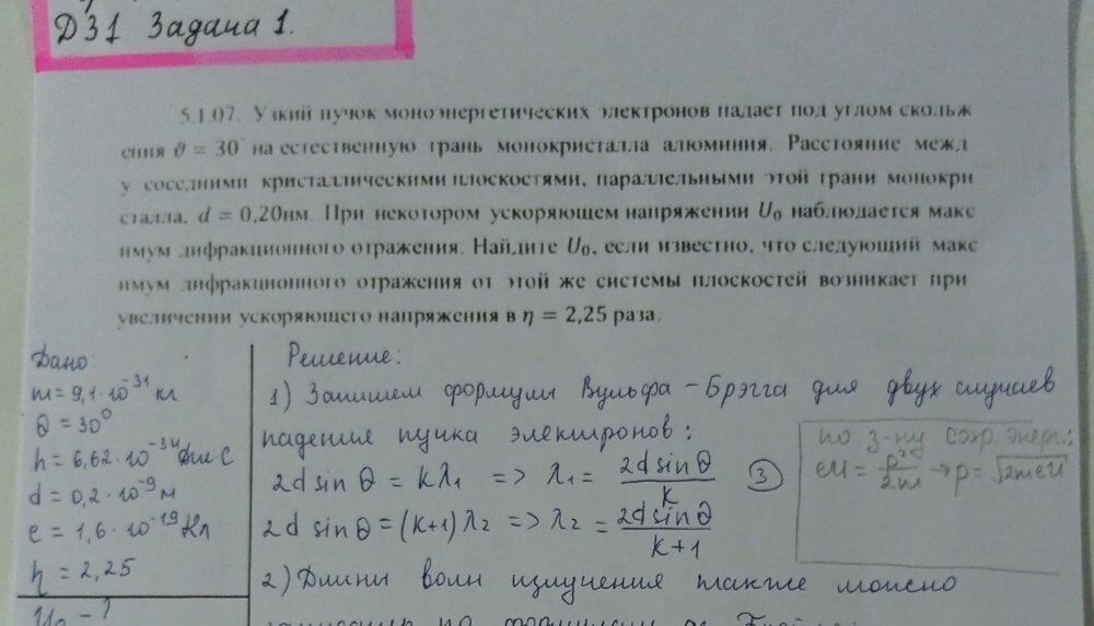 5.1.07. Узкий пучок моноэнергетических электронов падает под углом скольжения ϑ = 30° на естественную грань монокристалла алюминия. Расстояние между соседними кристаллическими плоскостями, параллельными этой грани монокристалла, d = 0,20 нм. При некотором ускоряющем напряжении U0 наблюдали максимум зеркального отражения. Найти U0, если известно, что следующий максимум зеркального отражения возникал при увеличении ускоряющего напряжения в η = 2,25 раза.