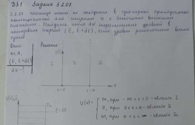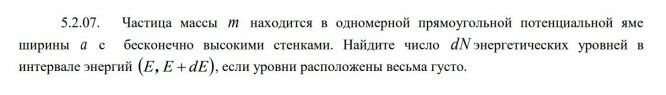 5.2.07. Частица массы m находится в одномерной прямоугольной потенциальной яме ширины a с бесконечно высокими стенками. Найдите число dN энергетических уровней в интервале энергий E, E dE , если уровни расположены весьма густо.