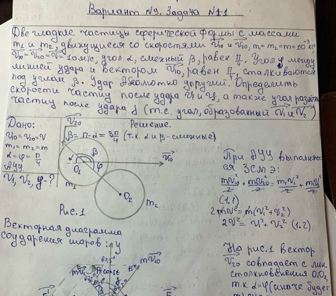 Две гладкие частицы сферической формы с массами m1 и m2, движущиеся со скоростями и , сталкиваются под углом b, как указано на рис.1. Расстояние до места встречи и скорости частиц соответствуют условиям соударения (отсутствию промаха). b - угол встречи, т.е. угол, образованный векторами и ;