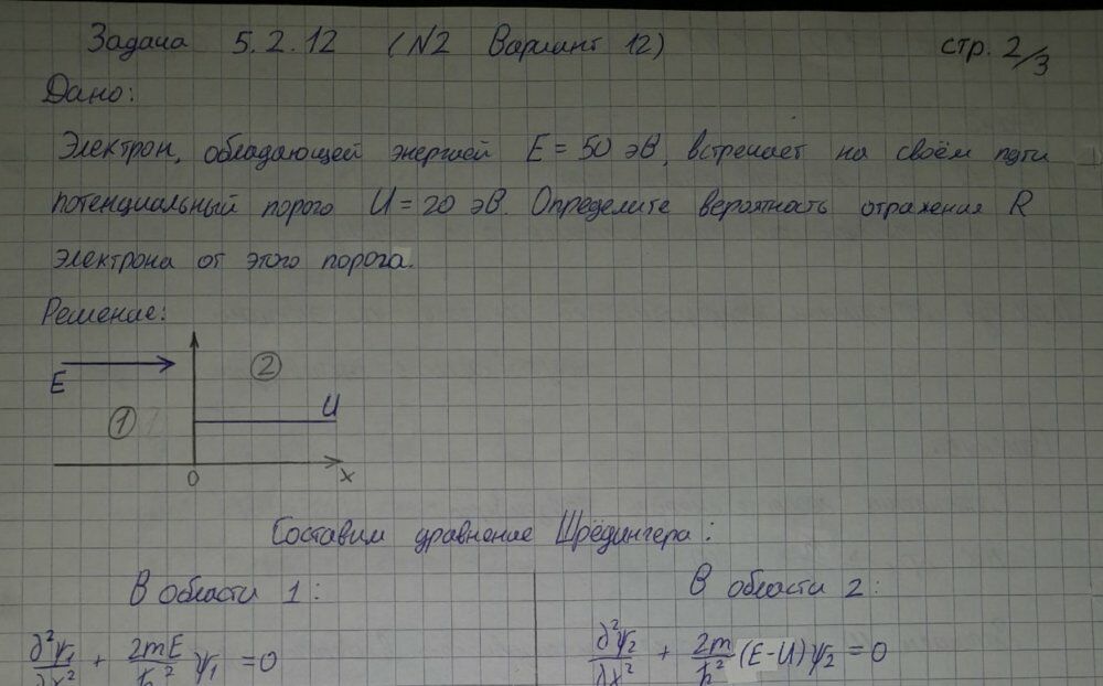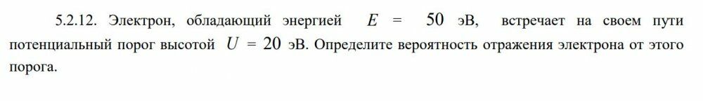5.2.12. Электрон, обладающий энергией E = 50 эВ, встречает на своем пути потенциальный порог высотой U = 20 эВ. Определите вероятность отражения электрона от этого порога.