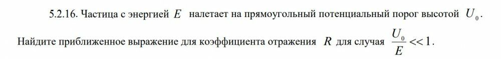 5.2.16. Частица с энергией E налетает на прямоугольный потенциальный порог высотой U0 . Найдите приближенное выражение для коэффициента отражения R для случая 1 0  E U .