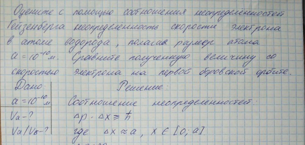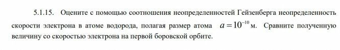 5.1.15. Оцените с помощью соотношения неопределенностей Гейзенберга неопределенность скорости электрона в атоме водорода, полагая размер атома 10 10 a м. Сравните полученную величину со скоростью электрона на первой боровской орбите.