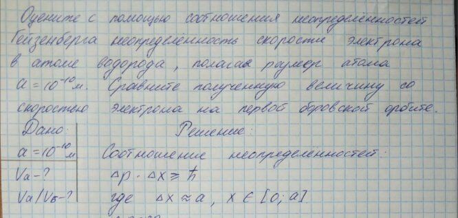5.1.15. Оцените с помощью соотношения неопределенностей Гейзенберга неопределенность скорости электрона в атоме водорода, полагая размер атома 10 10 a  м. Сравните полученную величину со скоростью электрона на первой боровской орбите.