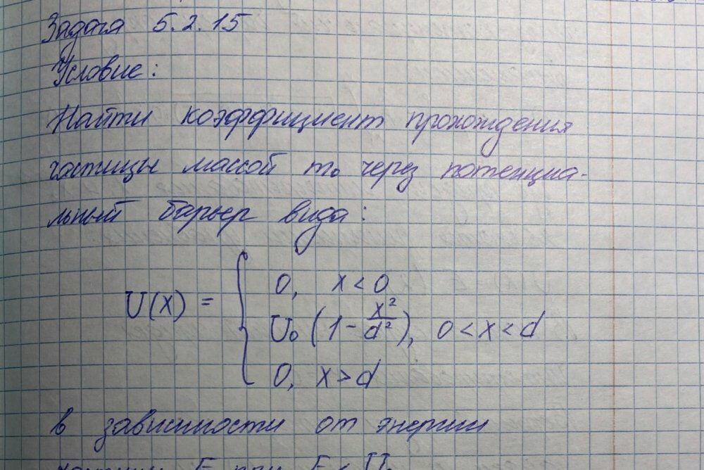 5.2.15. Найдите коэффициент прохождения частицы массой m0 через потенциальный барьер вида Ux = x d x d d x U x , , , 0 1 0 0 0 2 2 0 в зависимости от энергии частицы E при E U0 .