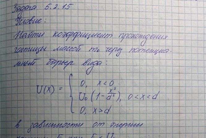 5.2.15. Найдите коэффициент прохождения частицы массой m0 через потенциальный барьер вида Ux =                   x d x d d x U x , , , 0 1 0 0 0 2 2 0 в зависимости от энергии частицы E при E  U0 .