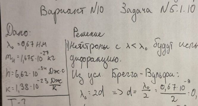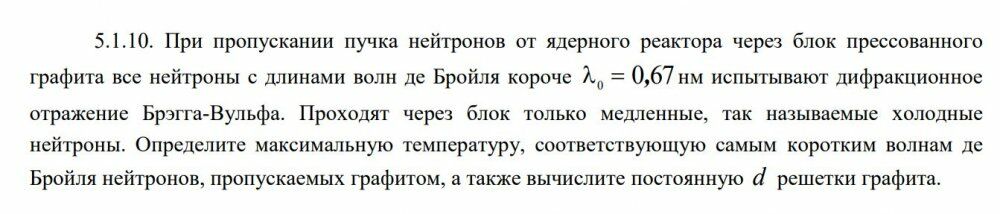 5.1.10. При пропускании пучка нейтронов от ядерного реактора через блок прессованного графита все нейтроны с длинами волн де Бройля короче 0  0,67 нм испытывают дифракционное отражение Брэгга-Вульфа. Проходят через блок только медленные, так называемые холодные нейтроны. Определите максимальную температуру, соответствующую самым коротким волнам де Бройля нейтронов, пропускаемых графитом, а также вычислите постоянную d решетки графита.