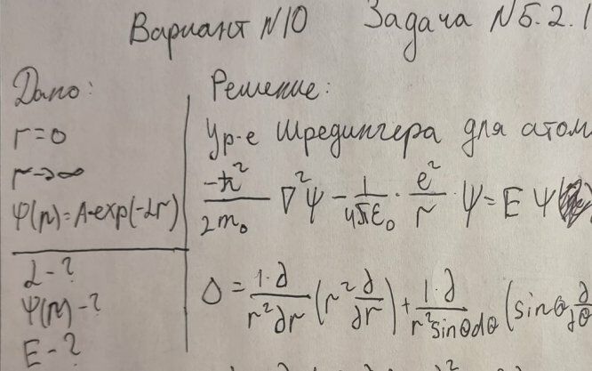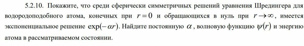 5.2.10. Покажите, что среди сферически симметричных решений уравнения Шредингера для водородоподобного атома, конечных при r  0 и обращающихся в нуль при r  , имеется экспоненциальное решение expαr . Найдите постоянную  , волновую функцию r и энергию атома в рассматриваемом состоянии.