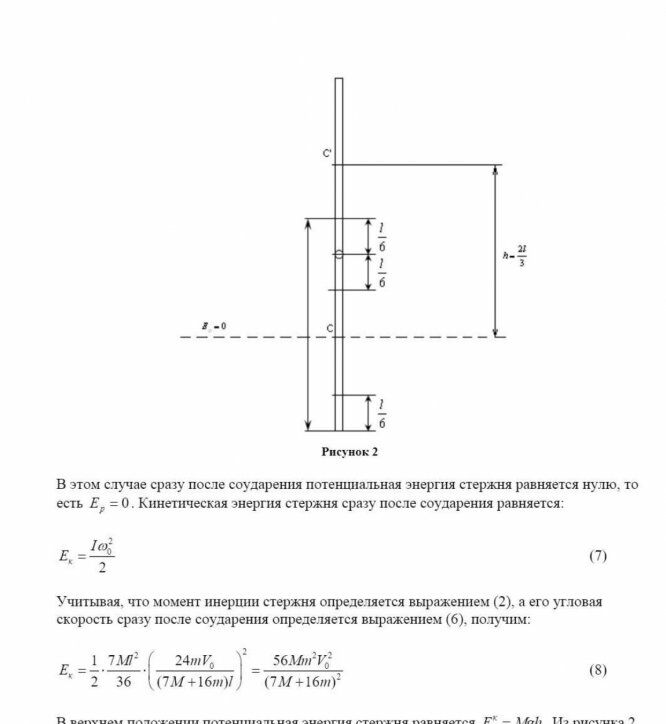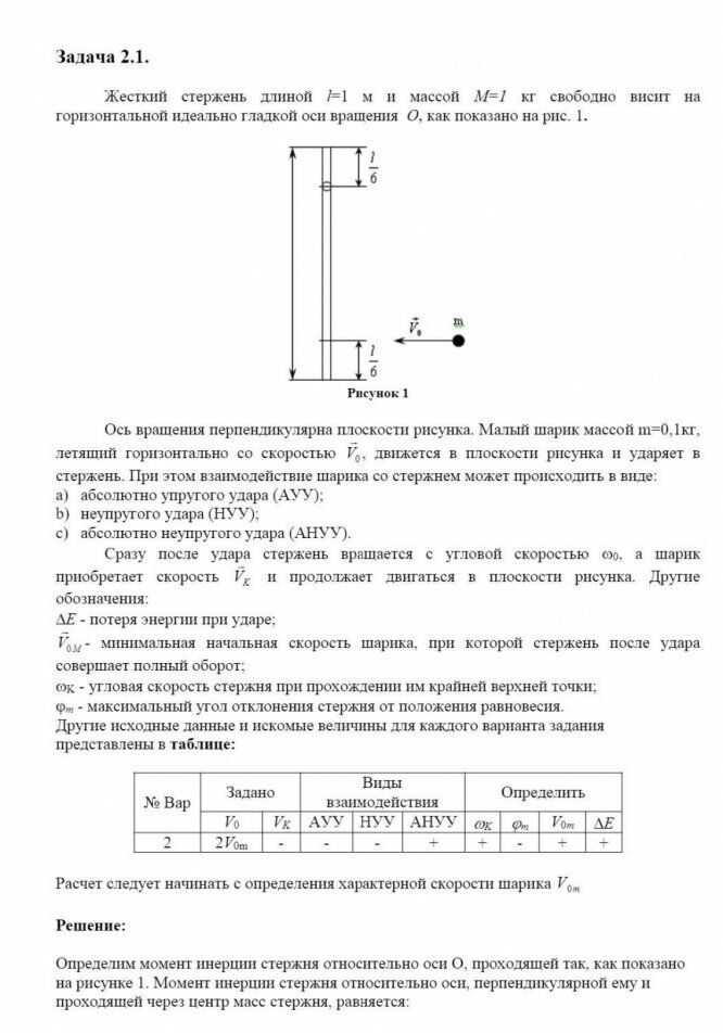 Однородный жесткий стержень длиной l=1 м и массой M=1 кг свободно висит на горизонтальной идеально гладкой оси вращения О, как показано на рис. 1. Ось вращения перпендикулярна плоскости рисунка. Малый шарик массой m=0,1кг, летящий горизонтально со скоростью , движется в плоскости рисунка и ударяет в стержень. При этом взаимодействие шарика со стержнем может происходить в виде: