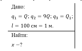 210. Два положительных заряда Q и 9Q закреплены на расстоянии 100 см друг от друга. Определить, в какой точке на прямой, проходящей через заряды, следует поместить третий заряд так, чтобы он находился в равновесии. Указать, какой знак должен иметь эт