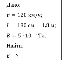 Автомобиль движется со скоростью 120 км/ч. Определить разность потенциалов на концах передней оси машины, если длина оси 180 см, а вертикальная составляющая вектора индукции магнитного поля земли равна 5∙10^(-5) Тл
