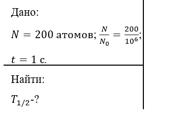 Для студентов по предмету Физика350. Из каждого миллиона атомов радиоактивного изотопа каждую секунду распадается 200 атомов. Определить период полураспада T_(1/2) изотопа350. Из каждого миллиона атомов радиоактивного изотопа каждую секунду распадается 200 атомов. Определить период полураспада T_(1/2) изотопа