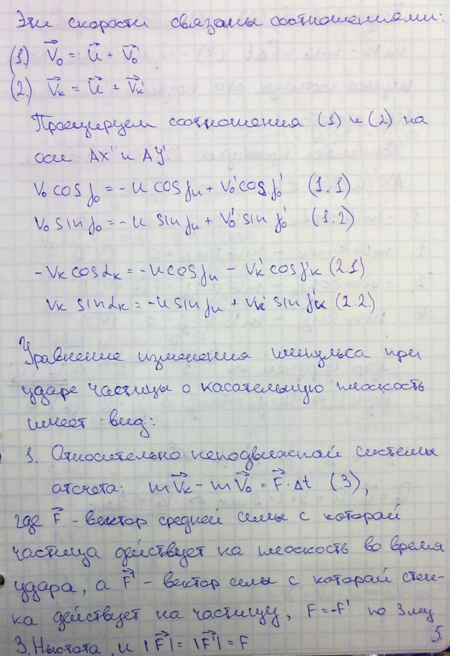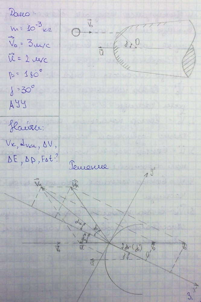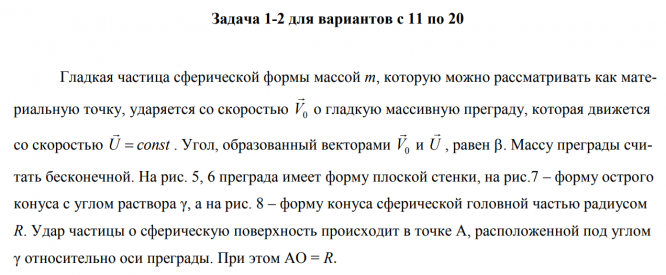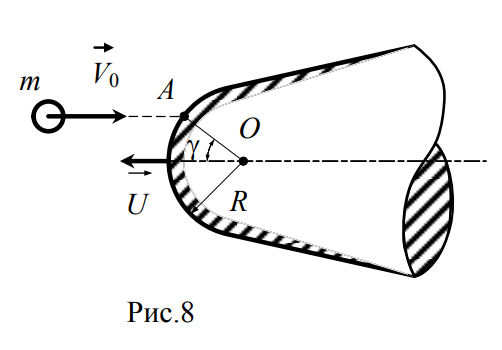 Гладкая частица сферической формы массой m, которую можно рассматривать как материальную точку, ударяется со скоростью V0  о гладкую массивную преграду, которая движется со скоростью U const  . Угол, образованный векторами V0  и U  , равен ..