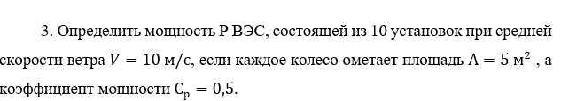 3. Определить мощность Р ВЭС, состоящей из 10 установок при средней скорости ветра V=10 м/с, если каждое колесо ометает площадь А=5 м^2 , а коэффициент мощности С_р=0,5.