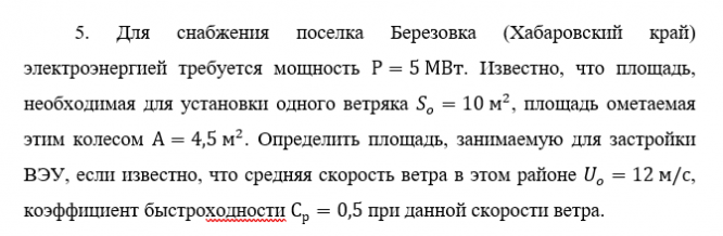 5. Для снабжения поселка Березовка (Хабаровский край) электроэнергией требуется мощность Р=5 МВт. Известно, что площадь, необходимая для установки одного ветряка S_o=10 м^2, площадь ометаемая этим колесом А=4,5 м^2. Определить площадь, занимаемую для заст
