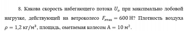 8. Какова скорость набегающего потока U_o при максимально лобовой нагрузке, действующей на ветроколесо F_лтах=600 Н? Плотность воздуха ρ=1,2 кг/м^3, площадь, ометаемая колесом А=10 м^2.
