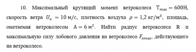 10. Максимальный крутящий момент ветроколеса Т_mах=600Н, скорость ветра U_o =10 м/с, плотность воздуха ρ=1,2 кг/м^3, площадь, ометаемая ветроколесом А=6 м^2. Найти радиус ветроколеса R и максимальную силу лобового давления на ветроколесо F_лmах, дей