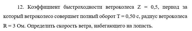 12. Коэффициент быстроходности ветроколеса Z = 0,5, период за который ветроколесо совершает полный оборот Т = 0,50 с, радиус ветроколеса R = 3 Ом. Определить скорость ветра, набегающего на лопасть.