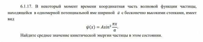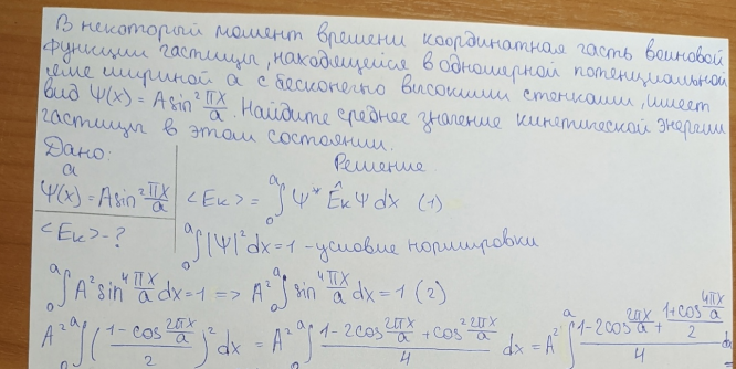 6.1.17. В некоторый момент времени координатная часть волновой функции частицы, находящейся в одномерной потенциальной яме шириной a с бесконечно высокими стенками, имеет вид 𝜓(𝑥) = 𝐴𝑠𝑖𝑛2 𝜋𝑥 𝑎 . Найдите среднее значение кинетической энергии частицы в этом состоянии.