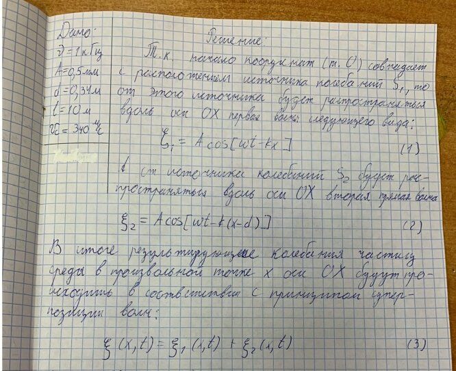 - Вывести уравнение колебаний частиц среды в точке М, находящейся на расстоянии l от второго излучателя. Считать, что направления колебаний частиц среды в точке М совпадают с осью x;