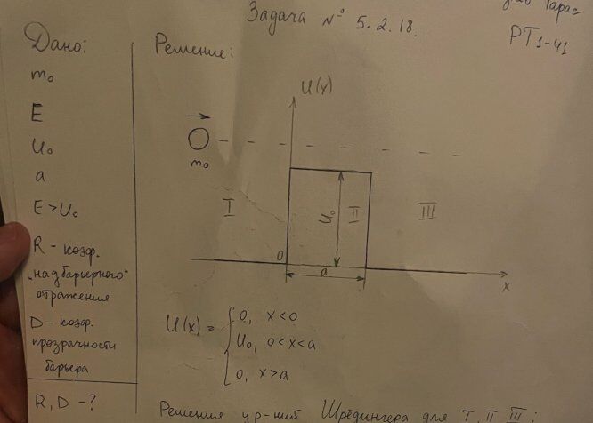 5.2.18. Частица массы m0 , обладающая энергией E , налетает на прямоугольный потенциальный барьер высотой U0 и шириной a . Энергия частицы E U0 . Найдите коэффициент “надбарьерного” отражения R и коэффициент прозрачности барьера D для этой частицы