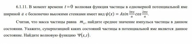 6.1.11. В момент времени t 0 волновая функция частицы в одномерной потенциальной яме шириной a с бесконечно высокими стенками имеет вид 𝜓(𝑥) = 𝐴𝑠𝑖𝑛 3𝜋𝑥 𝑎 𝑐𝑜𝑠 2𝜋𝑥 𝑎 . Считая, что масса частицы равна m0 , найдите среднее значение импульса частицы в данном состоянии. Укажите, суперпозицией каких состояний частицы в потенциальной яме является данное состояние. Найдите волновую функцию x,t.