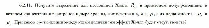 6.2.11. Получите выражение для постоянной Холла RH в примесном полупроводнике, в котором концентрации электронов и дырок равны, соответственно, n и p , а их подвижности –  n и  p . При каком соотношении между этими величинами эффект Холла будет отсутствовать?