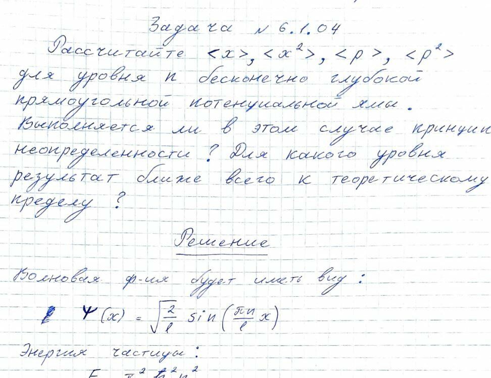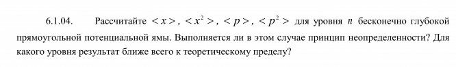 6.1.04. Рассчитайте 2 2 x , x , p , p для уровня n бесконечно глубокой прямоугольной потенциальной ямы. Выполняется ли в этом случае принцип неопределенности? Для какого уровня результат ближе всего к теоретическому пределу?