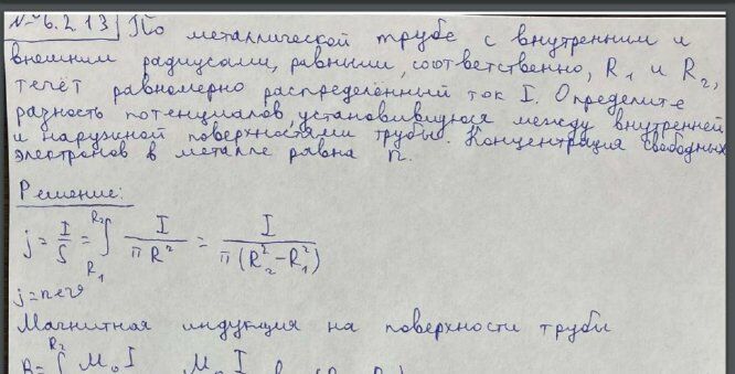 По металлической трубке с внутренним и внешним радиусами. Равными, соответственно, и , течет равномерно распределенный ток I. Определите разность потенциалов, установившуюся между внутренней и наружной поверхностями трубы. Концентрация свободных электронов в металле равна n.