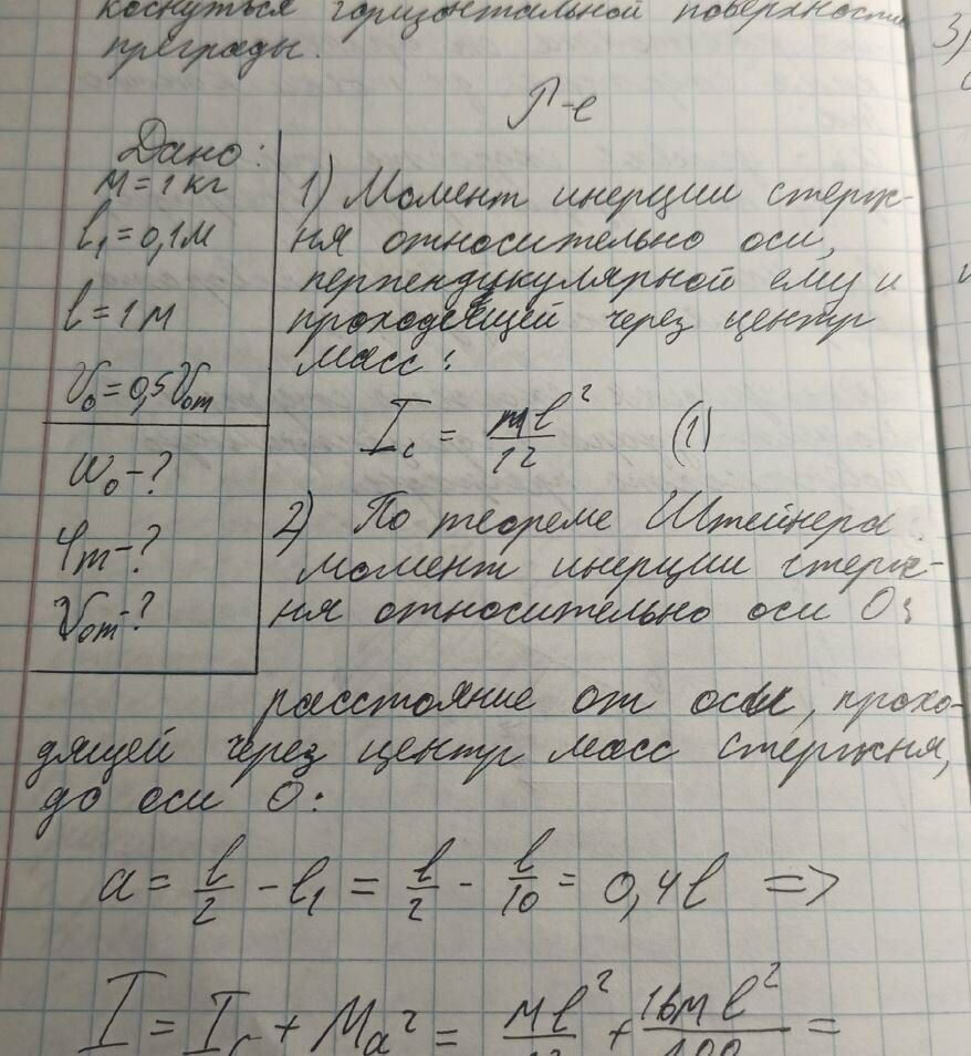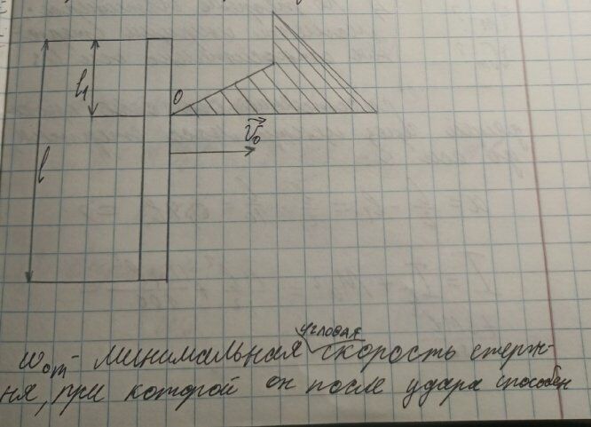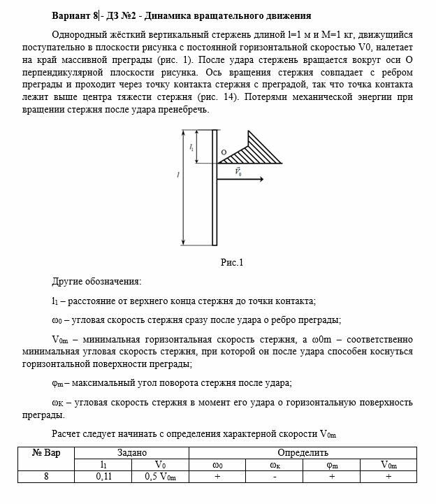 Однородный жёсткий вертикальный стержень длиной l=1 м и М=1 кг, движущийся поступательно в плоскости рисунка с постоянной горизонтальной скоростью V0, налетает на край массивной преграды (рис. 1). После удара стержень вращается вокруг оси O перпендикулярной плоскости рисунка. Ось вращения стержня совпадает с ребром преграды и проходит через точку контакта стержня с преградой, так что точка контакта лежит выше центра тяжести стержня (рис. 14). Потерями механической энергии при вращении стержня после удара пренебречь.Другие обозначения:l1 – расстояние от верхнего конца стержня до точки контакта;ω0 – угловая скорость стержня сразу после удара о ребро преграды;V0m – минимальная горизонтальная скорость стержня, а ω0m – соответственно минимальная угловая скорость стержня, при которой он после удара способен коснуться горизонтальной поверхности преграды;
