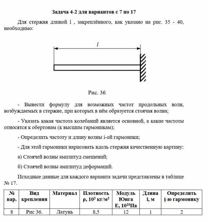 № вар. | Вид крепления | Материал | Плотность ρ, 103 кг/м3 | Модуль Юнга Е, 1010Па | Длина l, м | Определить i-ю гармонику |