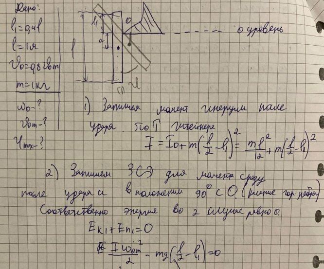 Однородный жёсткий вертикальный стержень длиной l=1 м и М=1 кг, движущийся поступательно в плоскости рисунка с постоянной горизонтальной скоростью V0, налетает на край массивной преграды (рис. 1). После удара стержень вращается вокруг оси O перпендикулярной плоскости рисунка. Ось вращения стержня совпадает с ребром преграды и проходит через точку контакта стержня с преградой, так что точка контакта лежит выше центра тяжести стержня (рис. 14). Потерями механической энергии при вращении стержня после удара пренебречь.Другие обозначения: