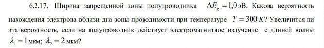 6.2.17. Ширина запрещенной зоны полупроводника E g 1,0 эВ. Какова вероятность нахождения электрона вблизи дна зоны проводимости при температуре T 300 𝐾? Увеличится ли эта вероятность, если на полупроводник действует электромагнитное излучение с длиной волны 1 1 мкм; 2 2 мкм?