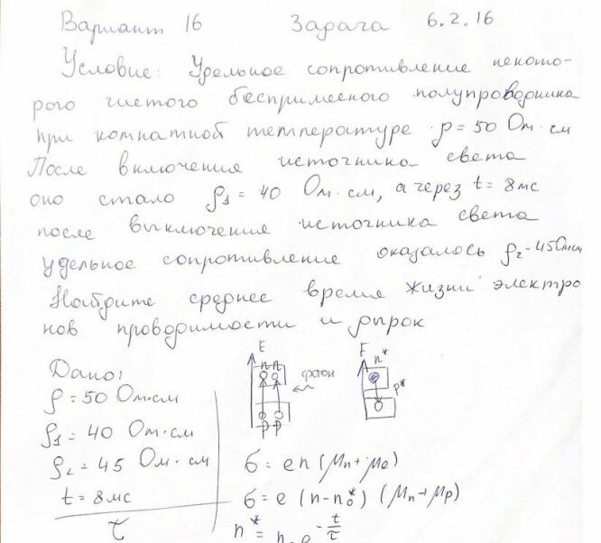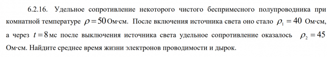 Задача 6.2.16. Удельное сопротивление некоторого чистого беспримесного полупроводника при комнатной температуре   50 Ом∙см. После включения источника света оно стало 1  40 Ом∙см, а через t  8 мс после выключения источника света удельное сопротивление оказалось  2  45 Ом∙см. Найдите среднее время жизни электронов проводимости и дырок.