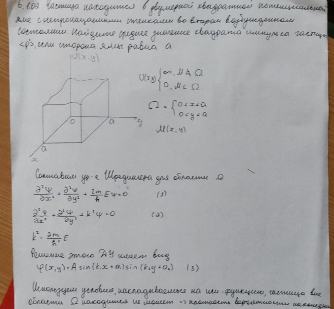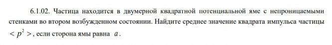 6.1.02. Частица находится в двумерной квадратной потенциальной яме с непроницаемыми стенками во втором возбужденном состоянии. Найдите среднее значение квадрата импульса частицы 2 p , если сторона ямы равна a .