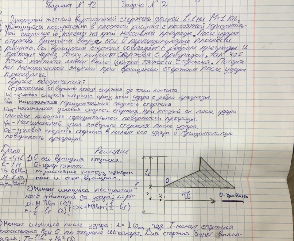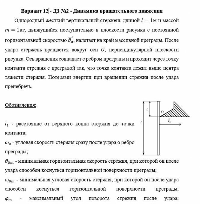 Однородный жёсткий вертикальный стержень длиной l=1 м и М=1 кг, движущийся поступательно в плоскости рисунка с постоянной горизонтальной скоростью V0, налетает на край массивной преграды (рис. 1). После удара стержень вращается вокруг оси O перпендикулярной плоскости рисунка. Ось вращения стержня совпадает с ребром преграды и проходит через точку контакта стержня с преградой, так что точка контакта лежит выше центра тяжести стержня (рис. 14). Потерями механической энергии при вращении стержня после удара пренебречь.Другие обозначения: