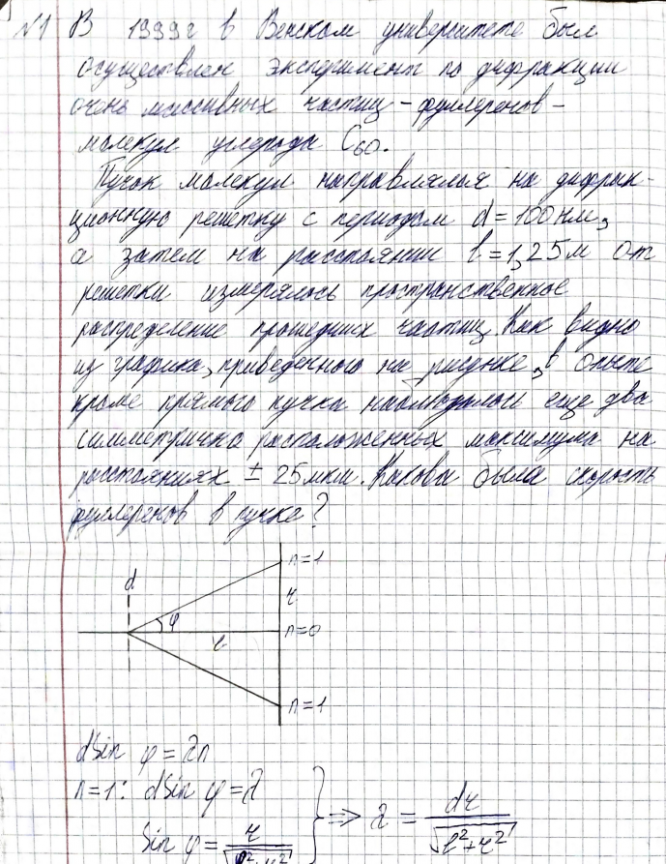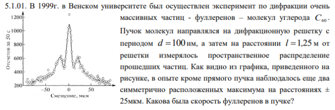 В 1999г. в Венском университете был осуществлен эксперимент по дифракции очень массивных частиц - фуллеренов – молекул углерода С60 . Пучок молекул направлялся на дифракционную решетку с периодом d 100 нм, а затем на расстоянии l 1,25 м от решетки измерялось пространственное распределение прошедших частиц. Как видно из графика, приведенного на рисунке, в опыте кроме прямого пучка наблюдалось еще два симметрично расположенных максимума на расстояниях ± 25мкм. Какова была скорость фуллеренов в пучке? .