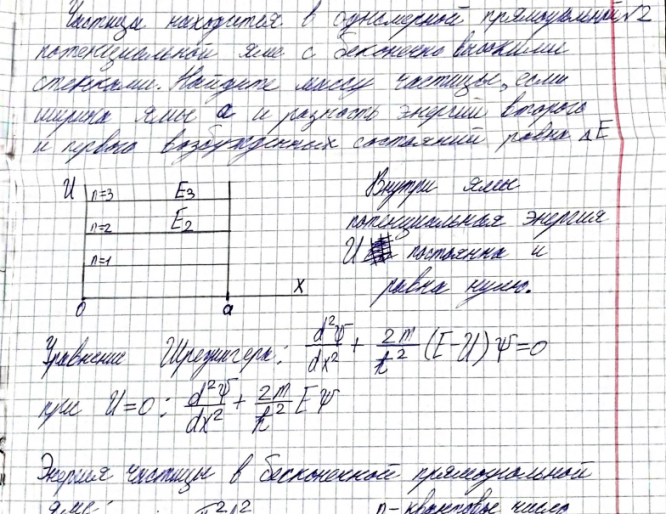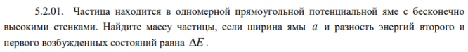 Частица находится в одномерной прямоугольной потенциальной яме с бесконечно высокими стенками. Найдите массу частицы, если ширина ямы a и разность энергий второго и первого возбужденных состояний равна E . .